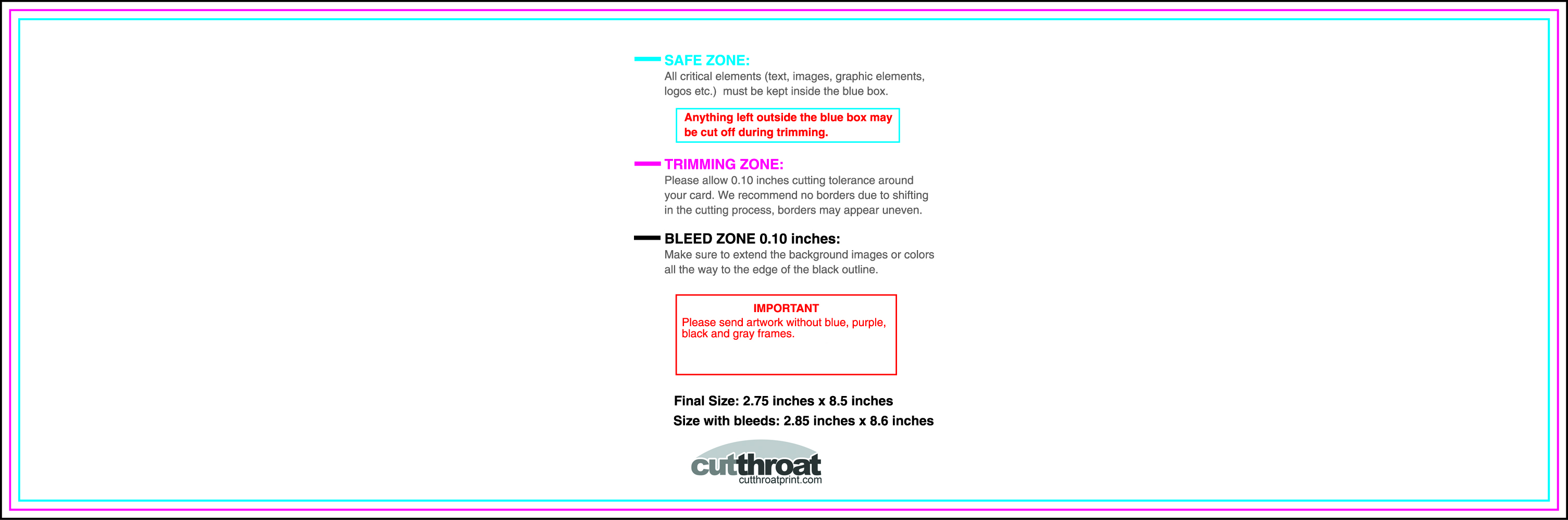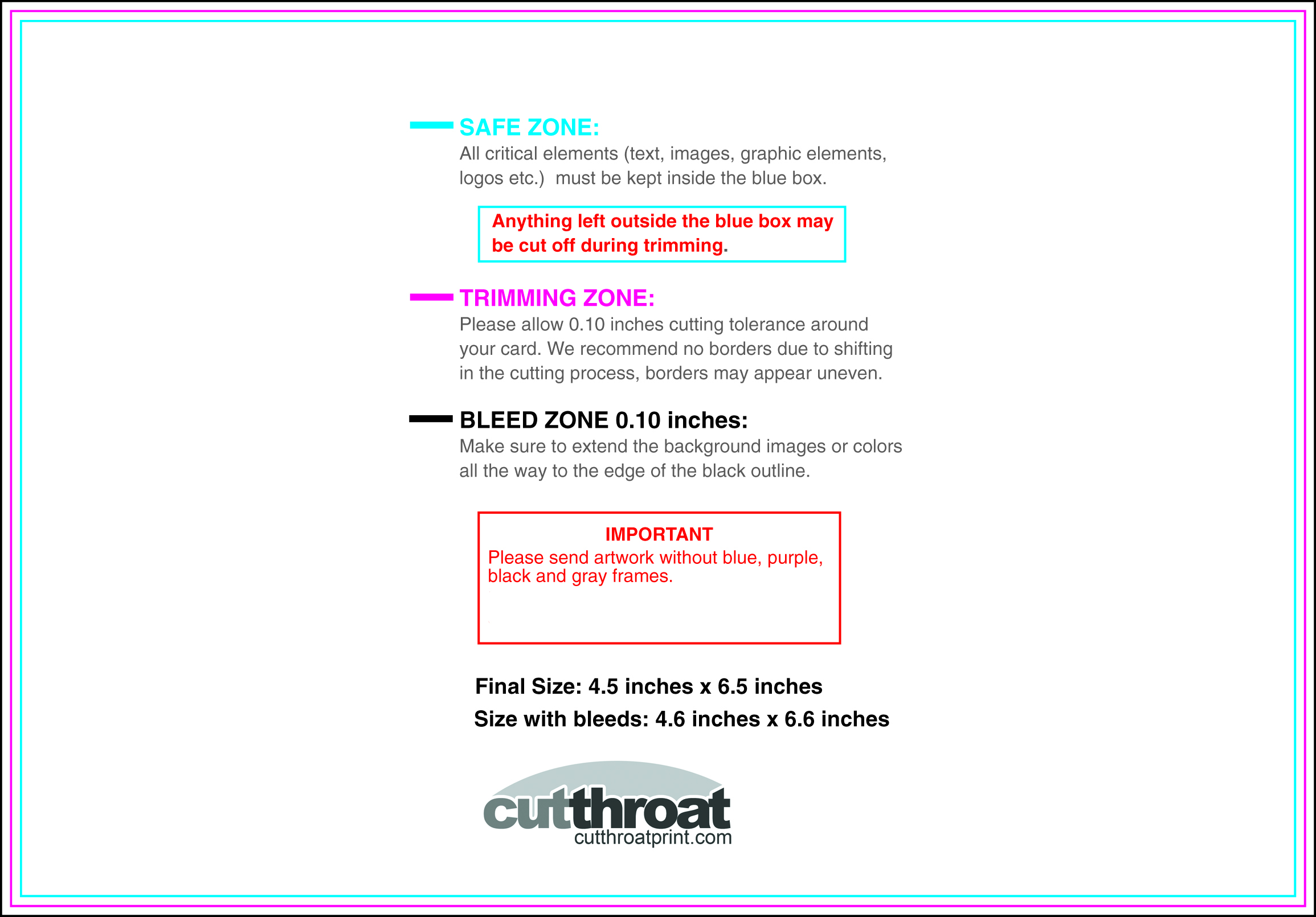 Download .JPG format templates. Use this pre-designed template to determine bleeds, trims and edges. Files sent to us that are not correctly formatted are subject to layout format work for $45 p/hour.